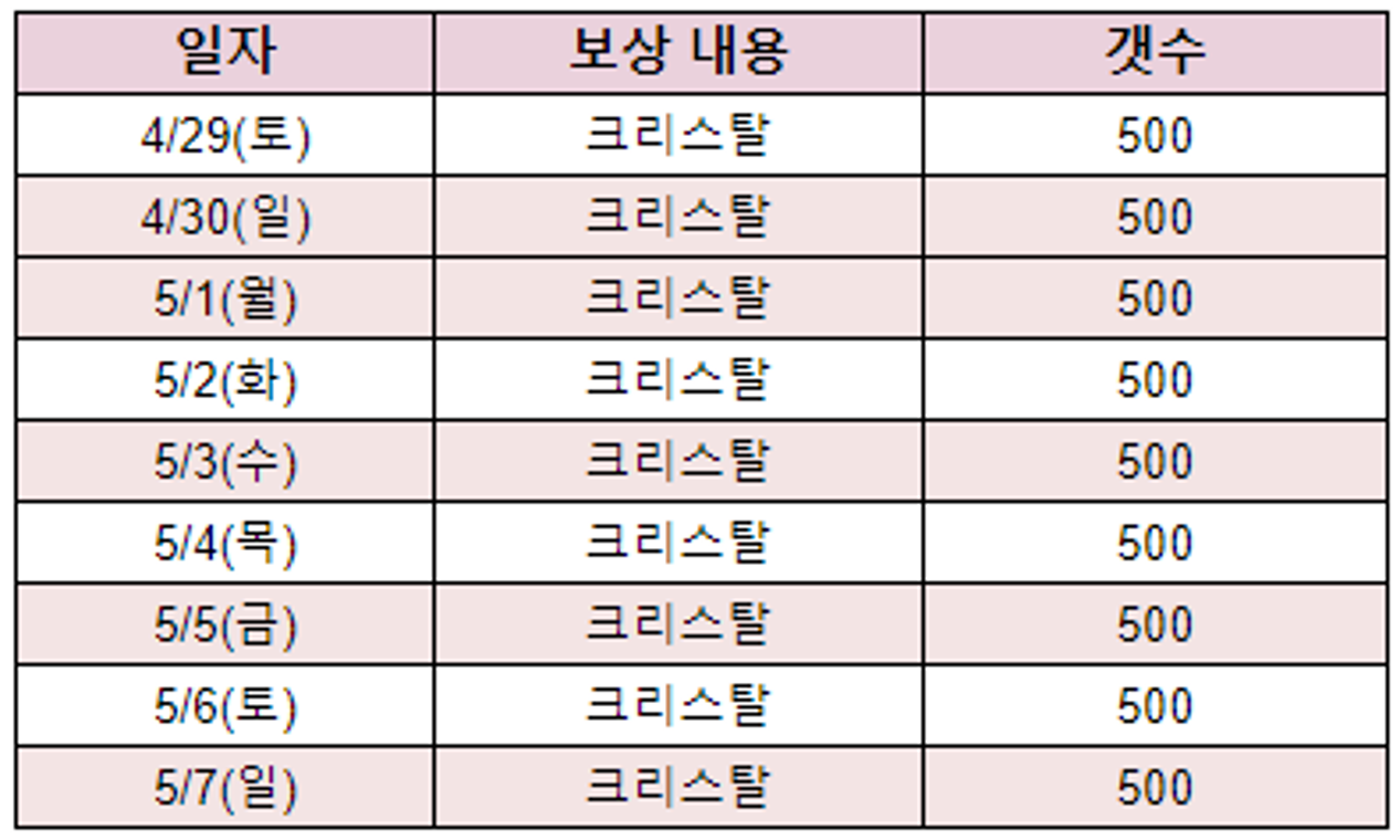 - 기간 : 4/29(토) 00:00 ~ 5/5(금) 23:59(+UTC 9)
