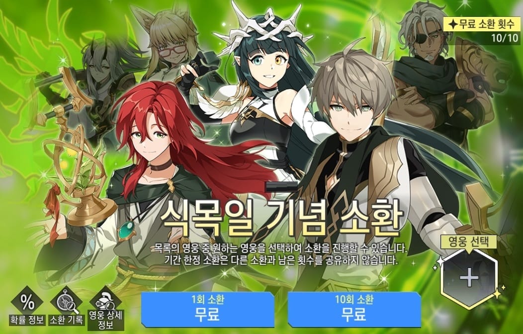 - 이벤트 기간 동안 식목일 기념 소환이 특별 개방됩니다. 해당 소환을 통해 일부 [대지] 속성 영웅과 해당 영웅의 아티팩트 소환을 진행할 수 있습니다.