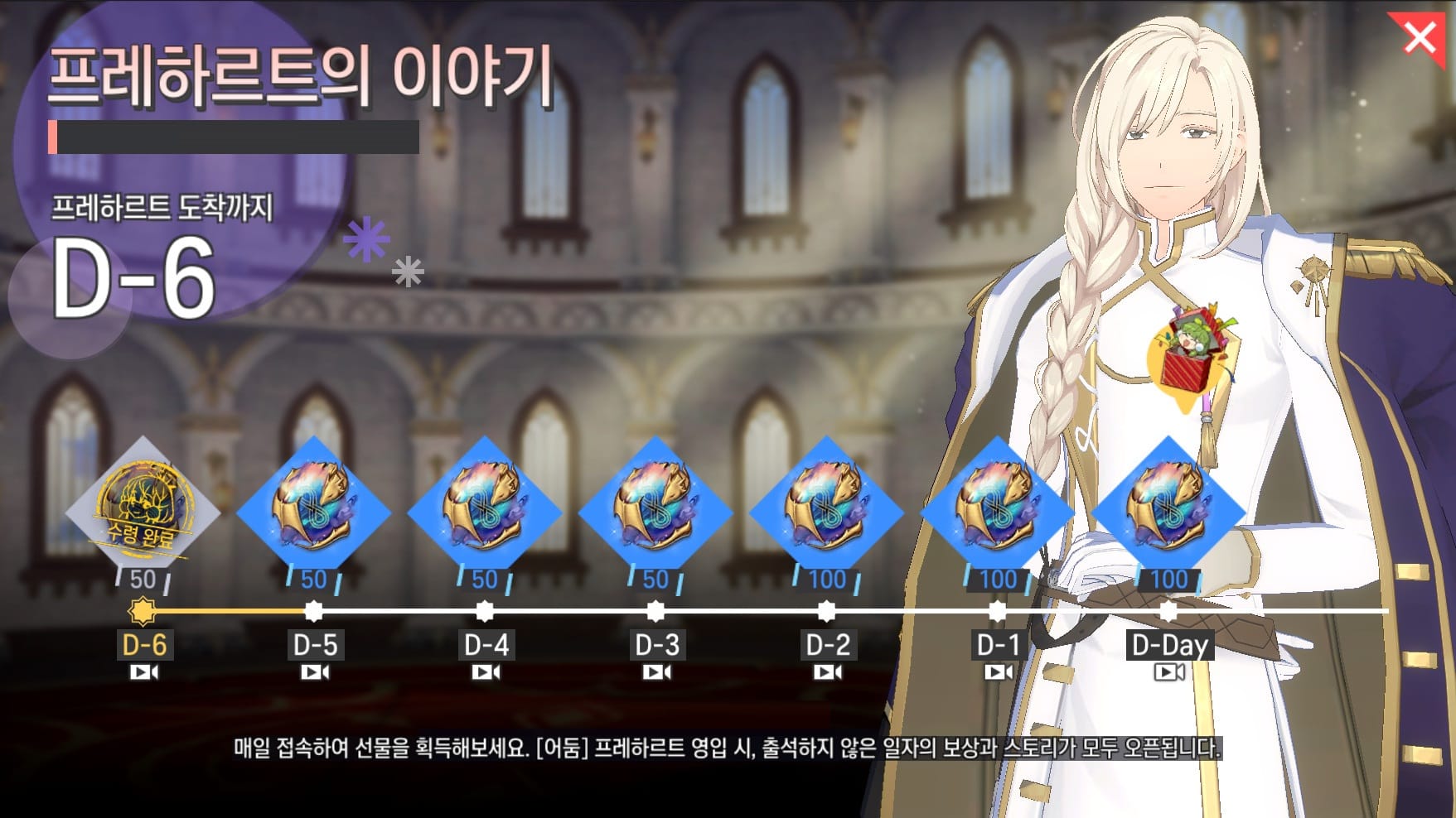※ 카운트 다운 출석부 종료 후에는 프레하르트를 영입해도 스토리가 오픈되지 않습니다.
